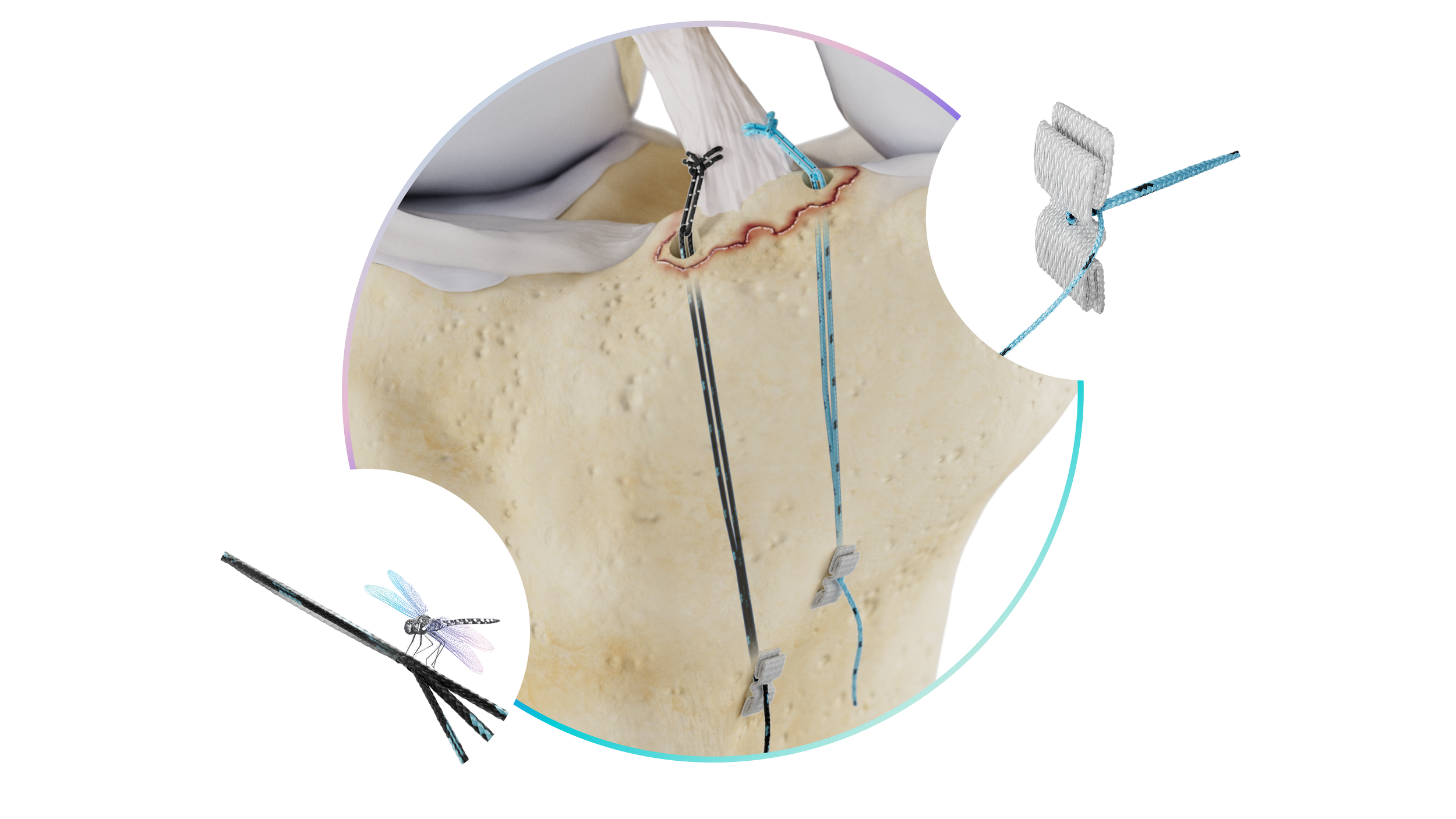 Each Repair Construct is powered by a Dragonfly quad core advanced finger trap, for simple, independent tissue tensioning. The surgeon securely attaches the Repair Construct to the tissue, shuttles the construct through a bone tunnel, and connects it to Native's titanium Bow-Tie button, or can select a Repair Construct that is preassembled with the patented Zerofly soft button fixation. Zerofly is a metal free cortical fixation technology designed to conform to the patient’s anatomy, while providing versatility for the surgeon. Once shuttled through the tunnel, simply pull the tail of the Dragonfly to optimize the tension of the construct and reduce the tissue to the bone.