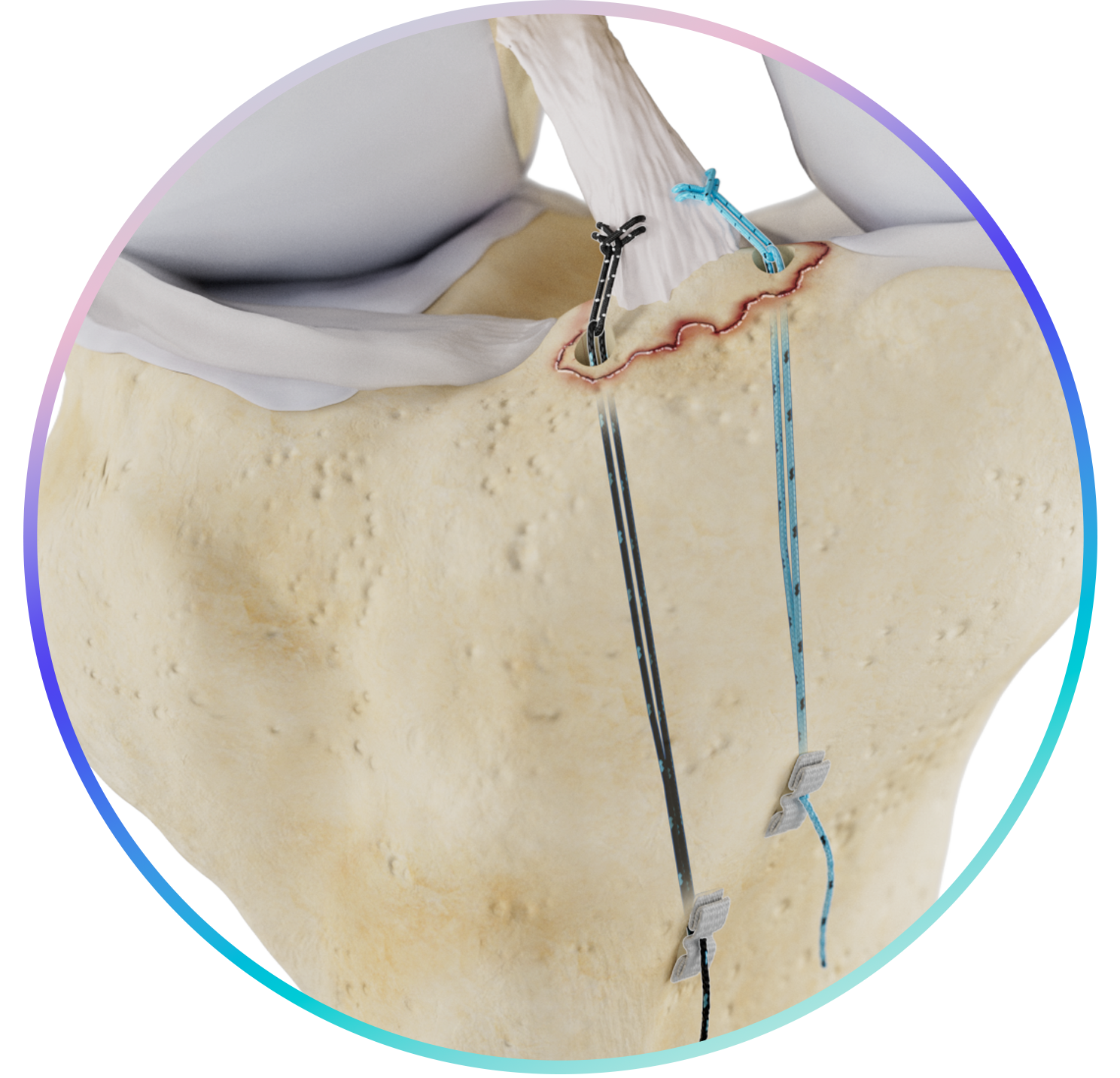Multiple points of fixation, reduced individually, or simultaneously, through our retensionable repair construct, powered by Dragonfly™ finger trap and Zerofly™ fixation.